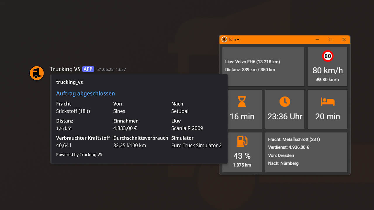 Trucking VS bietet eine automatische Auftragserfassung, umfangreiche Statistiken, ein integriertes Community-System, ein Live-Tracking deiner Freunde und Teammitglieder und vieles mehr.