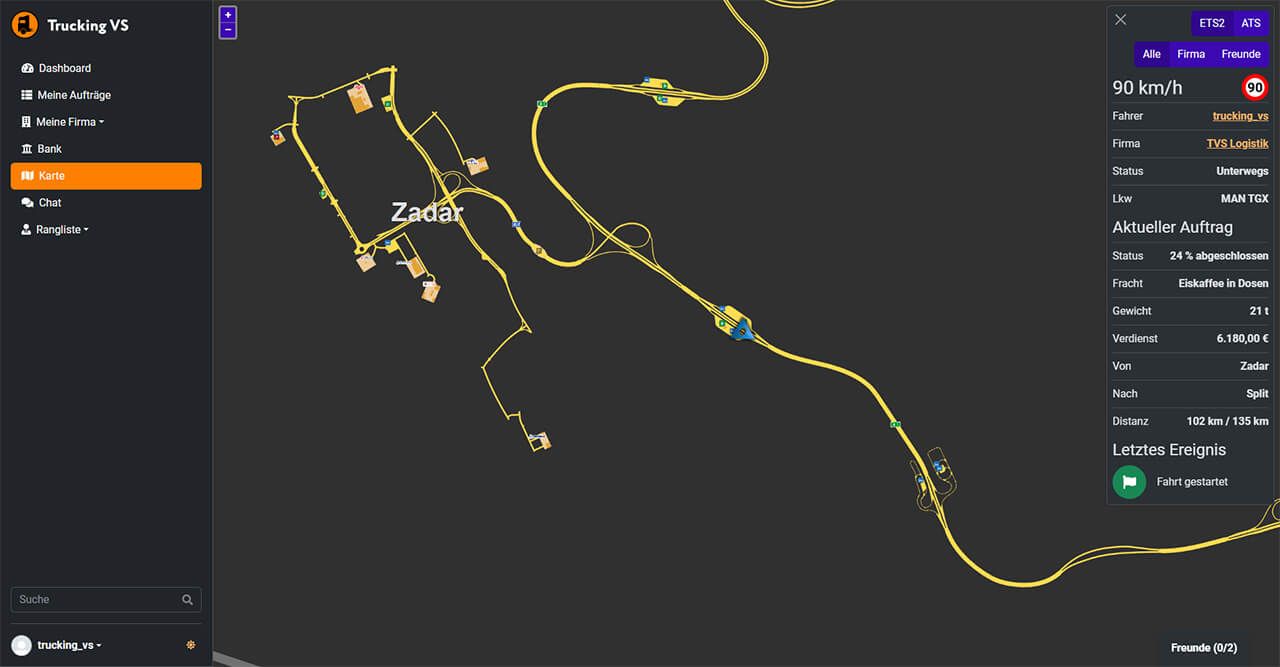 Du kannst jetzt einen Fahrer auf der Live-Karte verfolgen. Du siehst die Geschwindigkeit und den genutzten Lkw, sowie Informationen zum aktuellen Auftrag (erfordert Trucking VS Plus Standard).